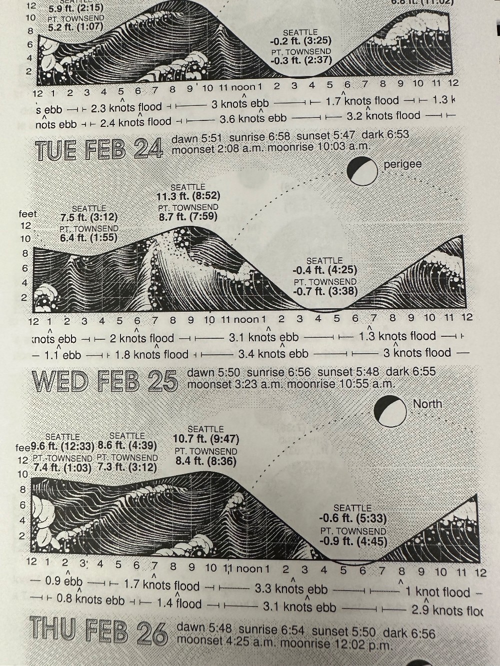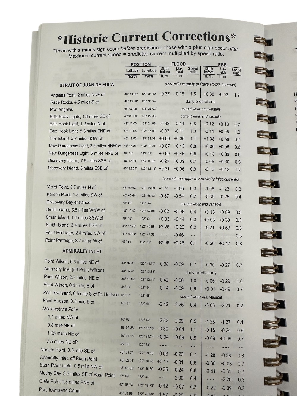 Daily Tidelog Graphics are based on NOAA predictions for Seattle with times and heights for Seattle and Port Townsend. Time and strength of maximum currents and times of slack water are shown daily in the North Sound at Admiralty Inlet, off Bush Point, and in the South Sound at Tacoma Narrows north end, at midstream. Included at the back of the Tidelog are tide tables for Toke Point and current tables for Race Rocks, Rosario Strait, Deception Pass, Lawrence Point and San Juan Channel. Also included are Tidal Current Charts, which offer a comprehensive view of the tidal currents throughout Puget Sound.