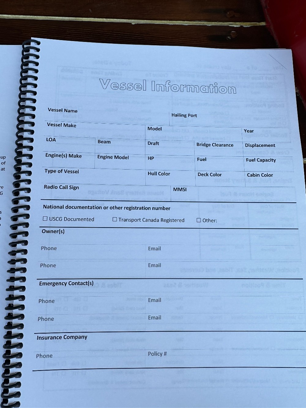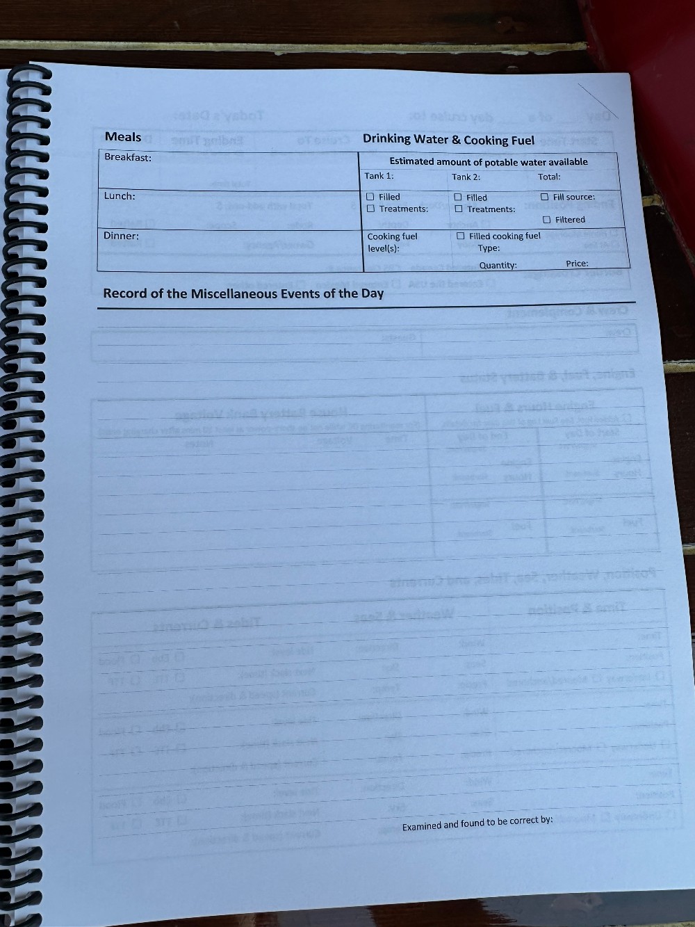 Each day is spread over two pages. The day’s details on the left, and meals, water and notes on the right. There are entries for sixty days. Then there are pages for eight fuelings, six emergency radio entries (only the USCG required ones, not normal radio uses), and a miscellaneous log for pumpouts, cooking fuel, and water filling.