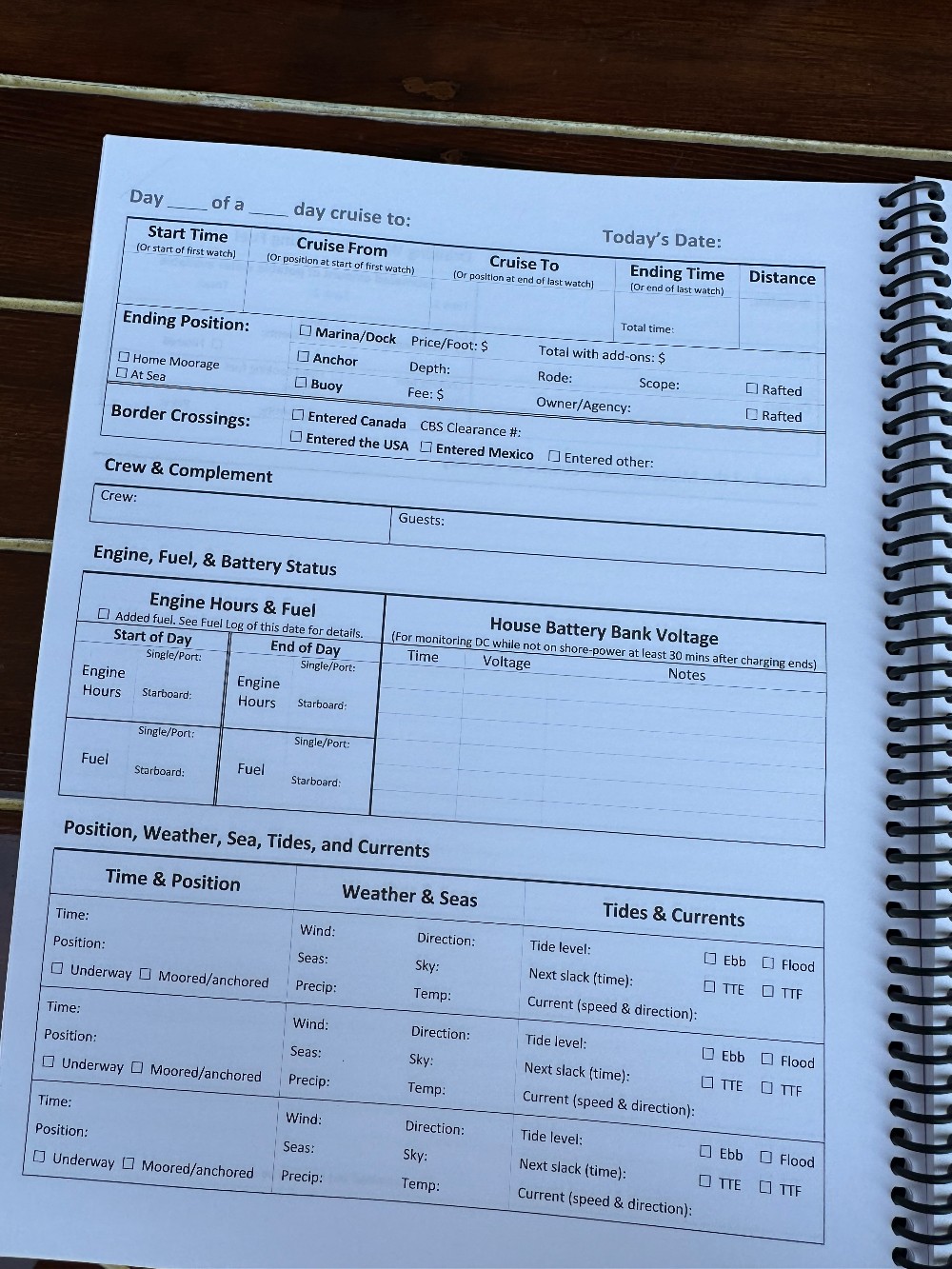 Every sailor has their own particular information that they wish to track. There are some very minimalist logbooks out there that are really just journals, and there are some very complex ones mostly aimed at professional mariners who must track a great deal more than pleasure boaters. Our version is more of a middle way… I wanted to record many of the important bits of information to keep a record for the boat, but also wanted enough journal space to keep a record of our adventures. This two-page version works well.