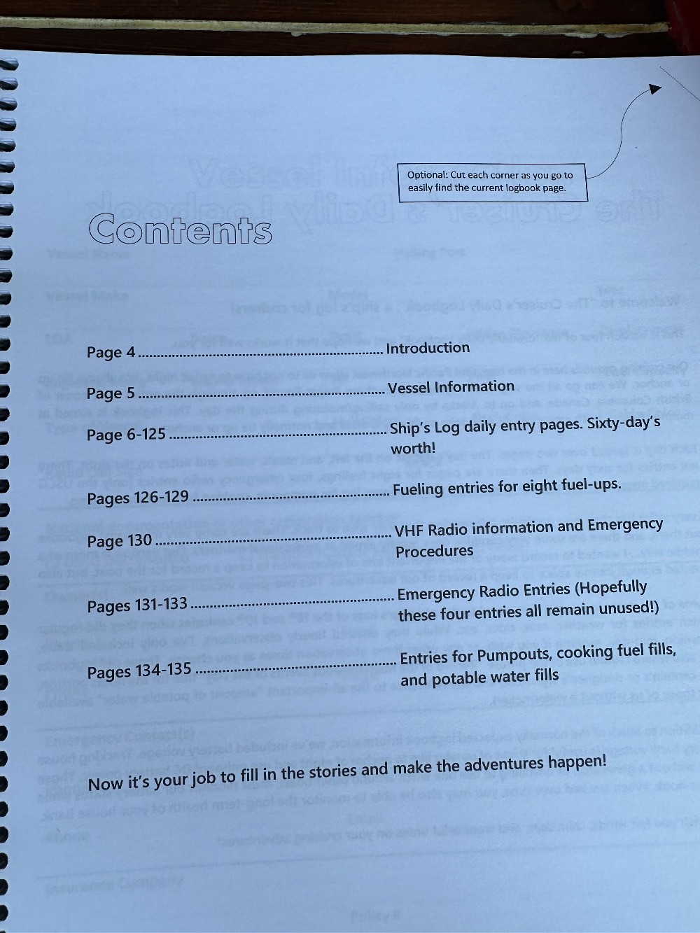 This logbook is aimed at cruising boaters, both motor or sail, who take multi-day cruises and normally tie up or anchor each night.