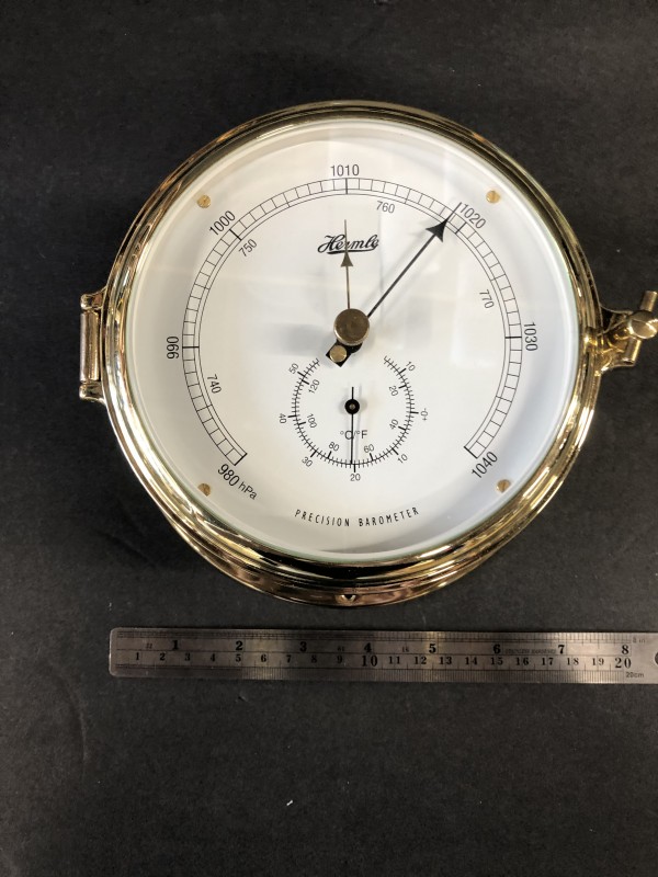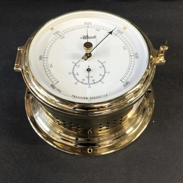 'Annapolis' by Hermle features a solid polished brass case features a barometer and thermometer behind a crystal glass lens.