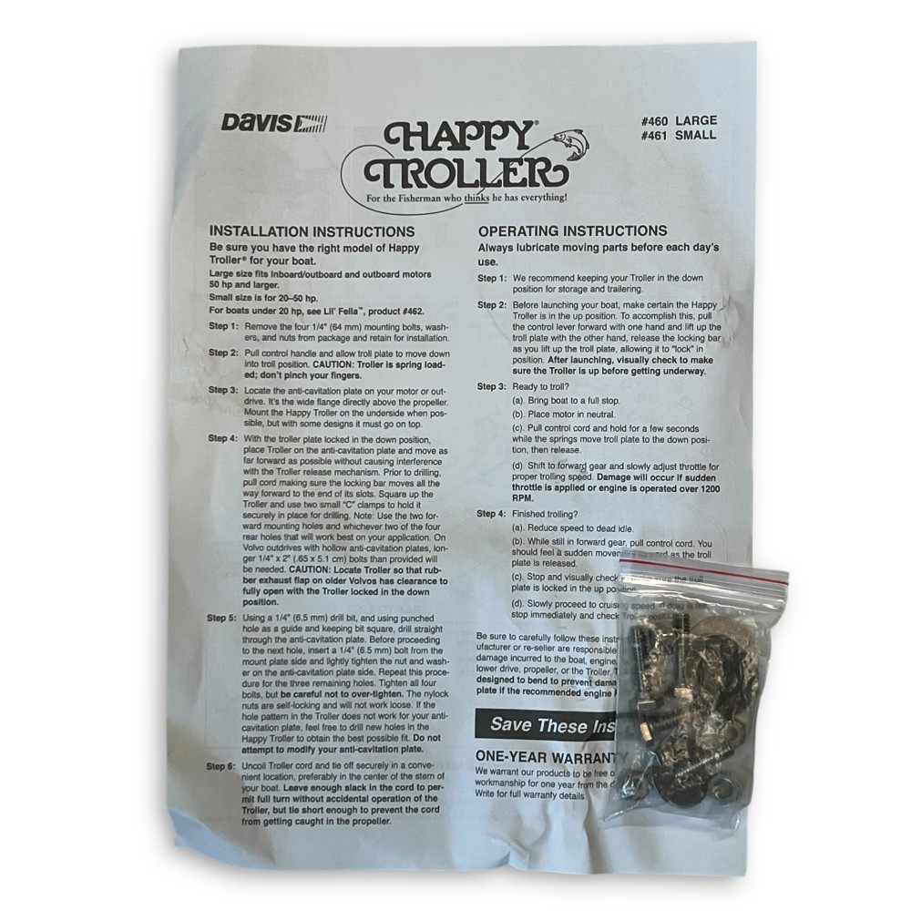 A significant invention in the sport of troll fishing, Happy Troller® mounts on the anti-cavitation plate to allow fine control of trolling speed. At cruising speed, your boat’s stability is enhanced.
